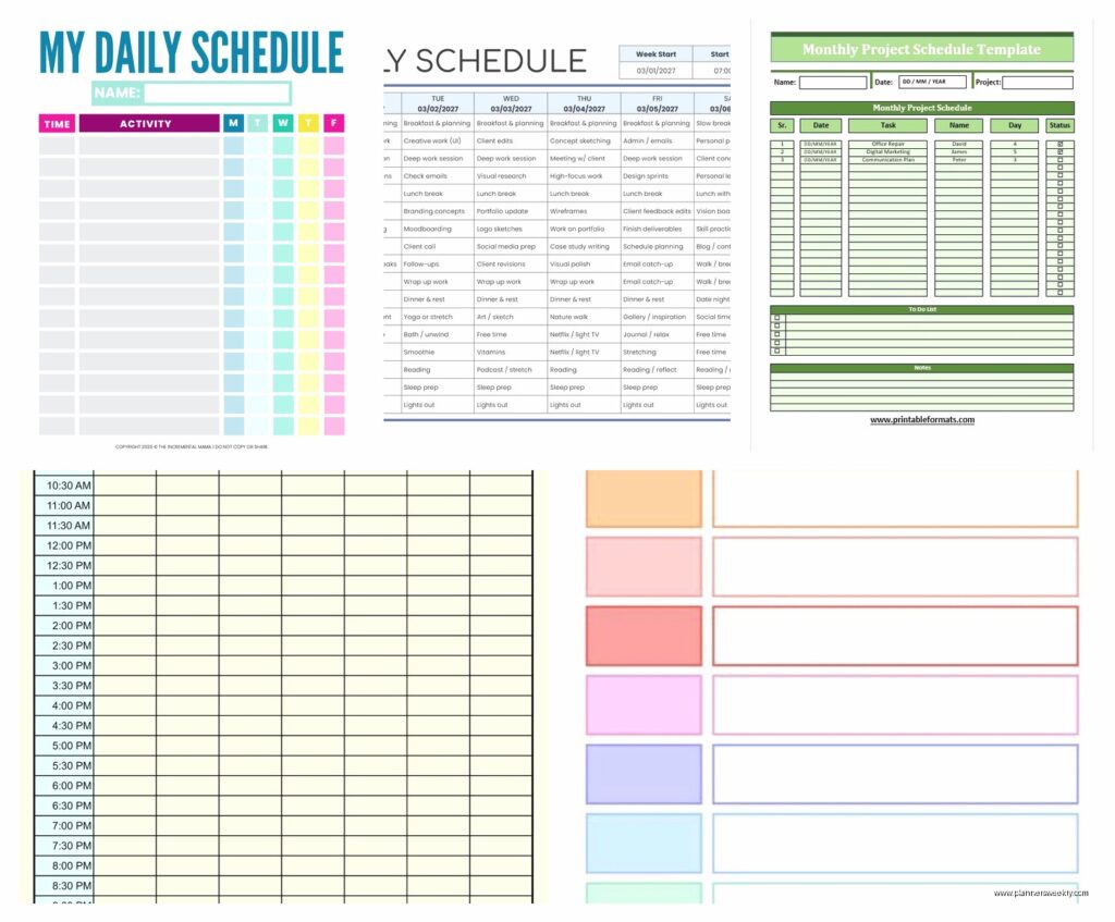 Use conditional formatting to automatically color-code different types of activities. Set up data validation with drop-down lists so you’re selecting from preset options instead of typing everything manually. Freeze the top row and left column so your headers stay visible when you scroll. These small things make spreadsheet schedules way more usable.