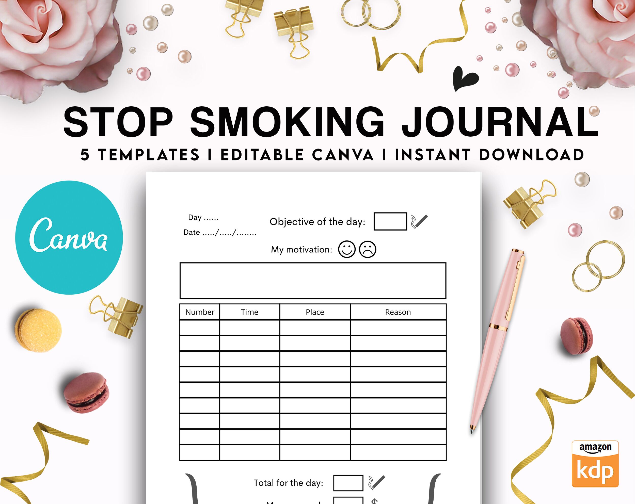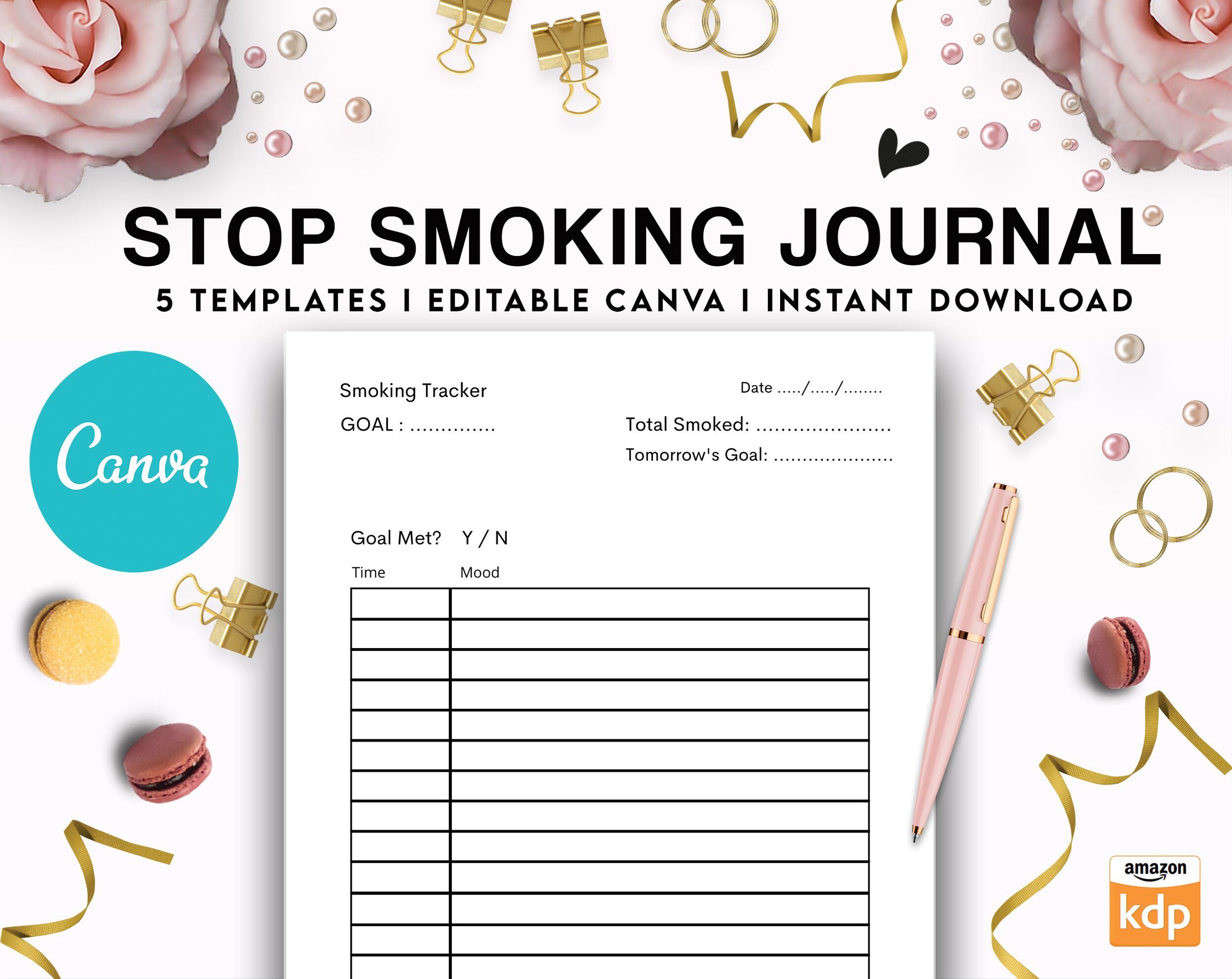 This digital product includes 5 EDITABLE CANVA Stop Smoking Journal Templates.